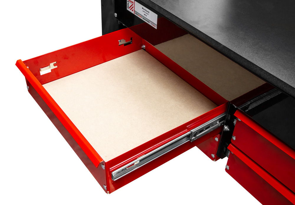 Πάγκος εργασίας με τέσσερα συρτάρια,πολύ εύκολη συναρμολόγηση, χάρη στο σύστημα plug-in,μεγάλη επιφάνεια εργασίας MDF, σε ένα ανθεκτικό μεταλλικό σκελετό,συμπεριλαμβανομένων των 20 ατομικά τοποθετημένα άγκιστρα για την πλάτη.
